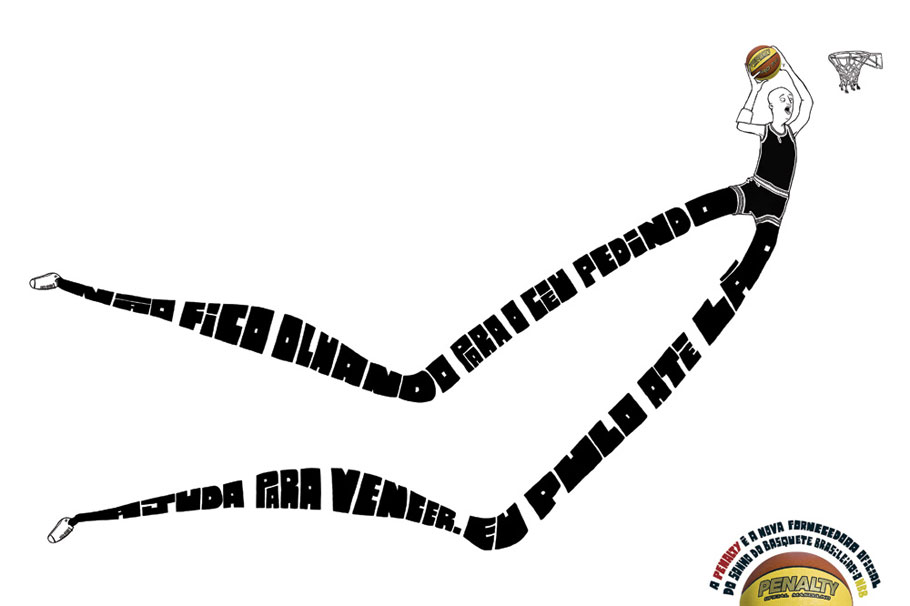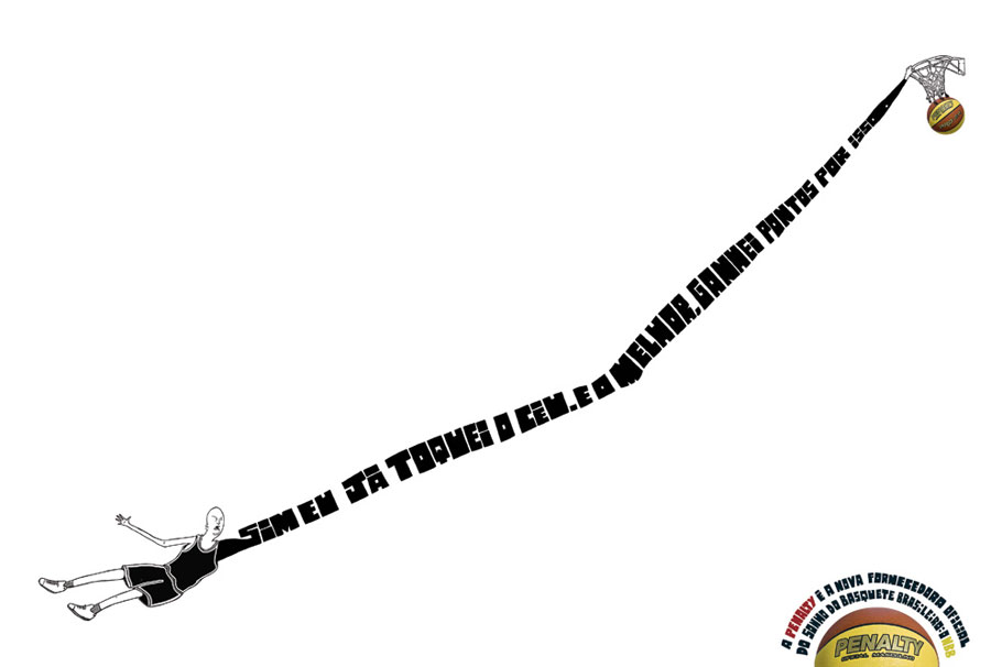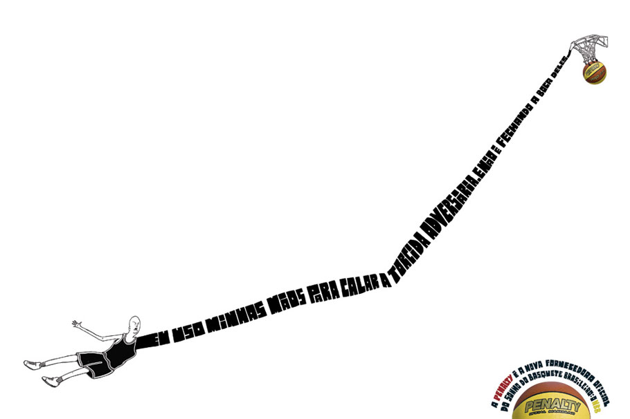 Campanha de mídia impressa da Penalty anunciando a parceria com o Novo Basquete Brasil (NBB). As frases dos anúncios são: “Eu uso a minha mão para calar a torcida adversário. E não é fechando a boca deles”, “Eu encaro dois gigantes ao mesmo tempo. Meu adversário e a distância até a cesta” e “Imagine um alvo pequeno de longe. A cesta é menor ainda”.