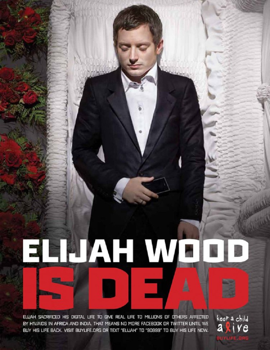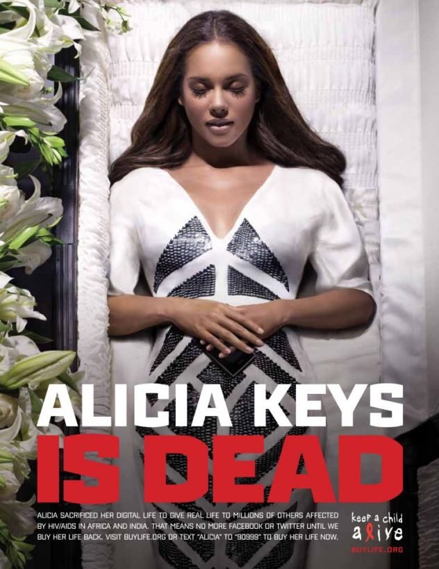 Campanha da ONG Keep a Child Alive ação pelo Dia Mundial de Combate à Aids. Lady Gaga, Alicia Keys, Justin Timberlake, Elijah Wood, Serena Willians entre outros nomes internacionais irão “morrer” na internet, ou seja, ficarão sem entrar no Twitter ou Facebook, até que os fãs doem US$ 1 milhão à entidade.