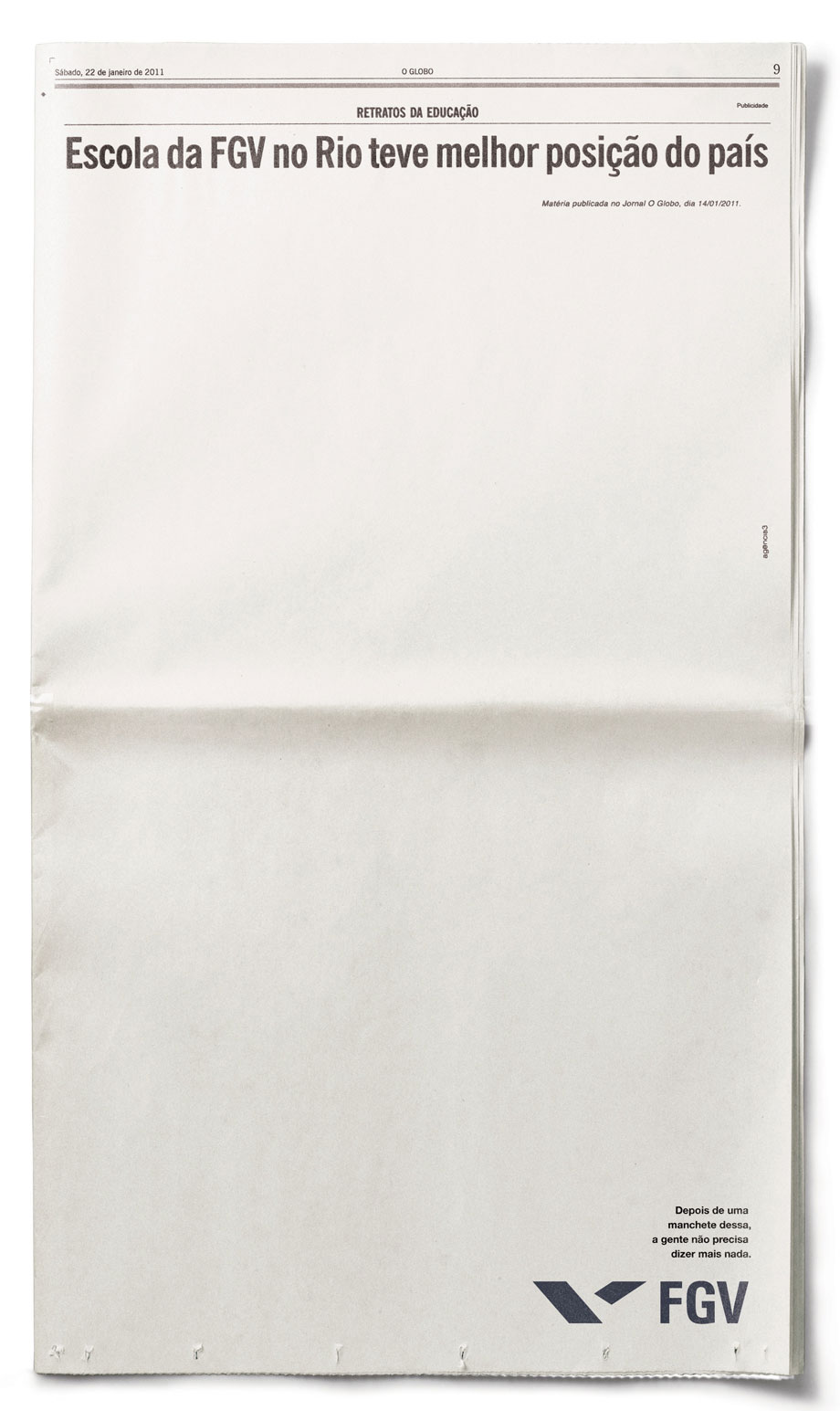 A FGV lançou este anúncio com criação da Agência3 comemorando o título de melhor do país segundo o ranking do MEC. No anúncio foi replicado exatamente o título de uma matéria do jornal O Globo que trazia a nota do título conquistado. Simples e impactante. Muito bom.