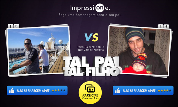 Está no ar a campanha digital Tal Pai, Tal Filho, criada pela GIOVANNI+DRAFTFCB para a HP em homenagem ao Dia dos Pais. Através do hotsite http://talpaitalfilho.net/, os usuários podem enviar fotos com seus pais/filhos que mostrem não só a semelhança física entre eles, mas também uma atmosfera de identificação natural na relação. No site ainda é possível descobrir quais computadores HP combinam mais com o seu pai, seja ele um pai viajante, um pai musical, um pai caseiro ou um pai executivo.