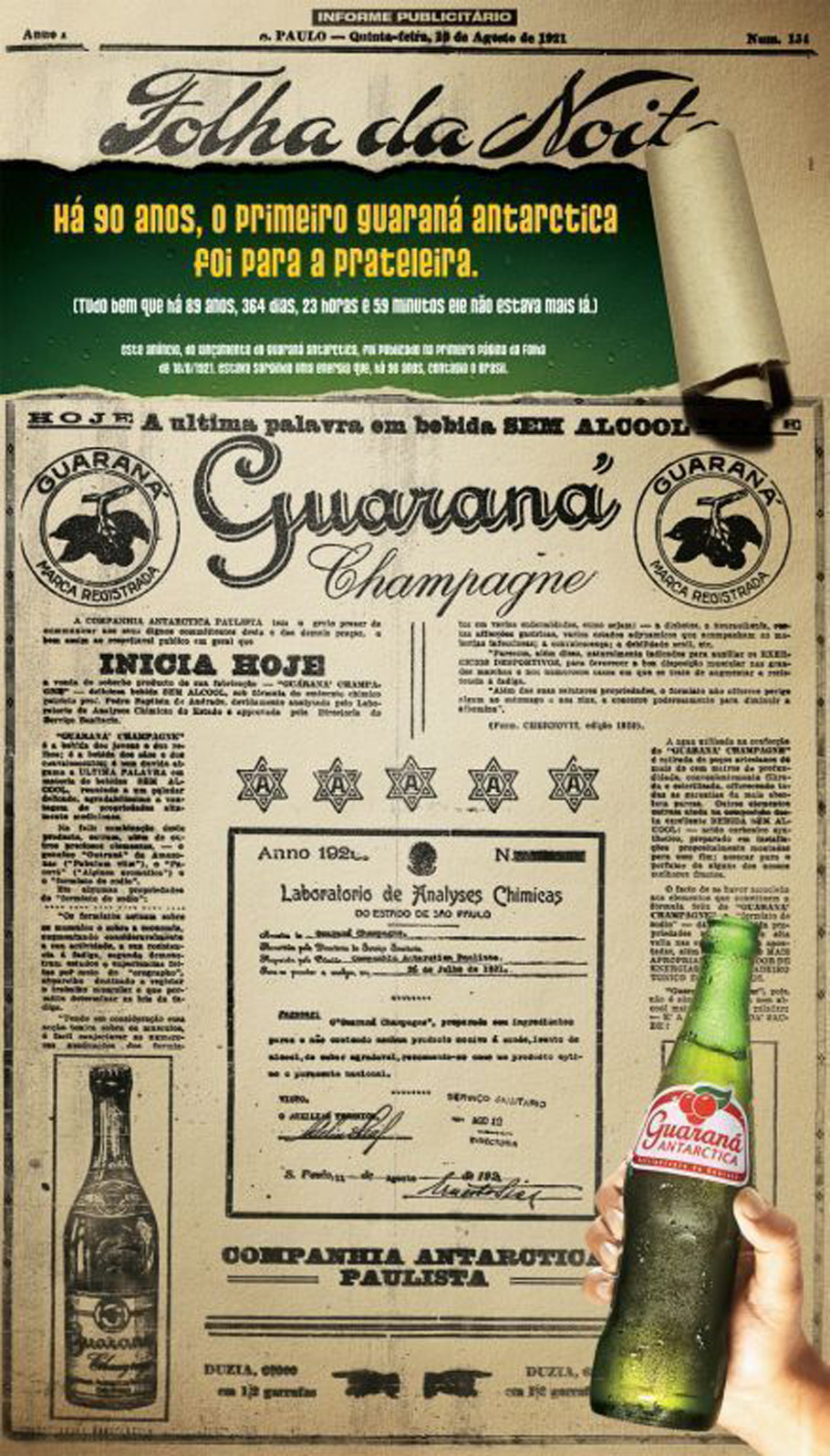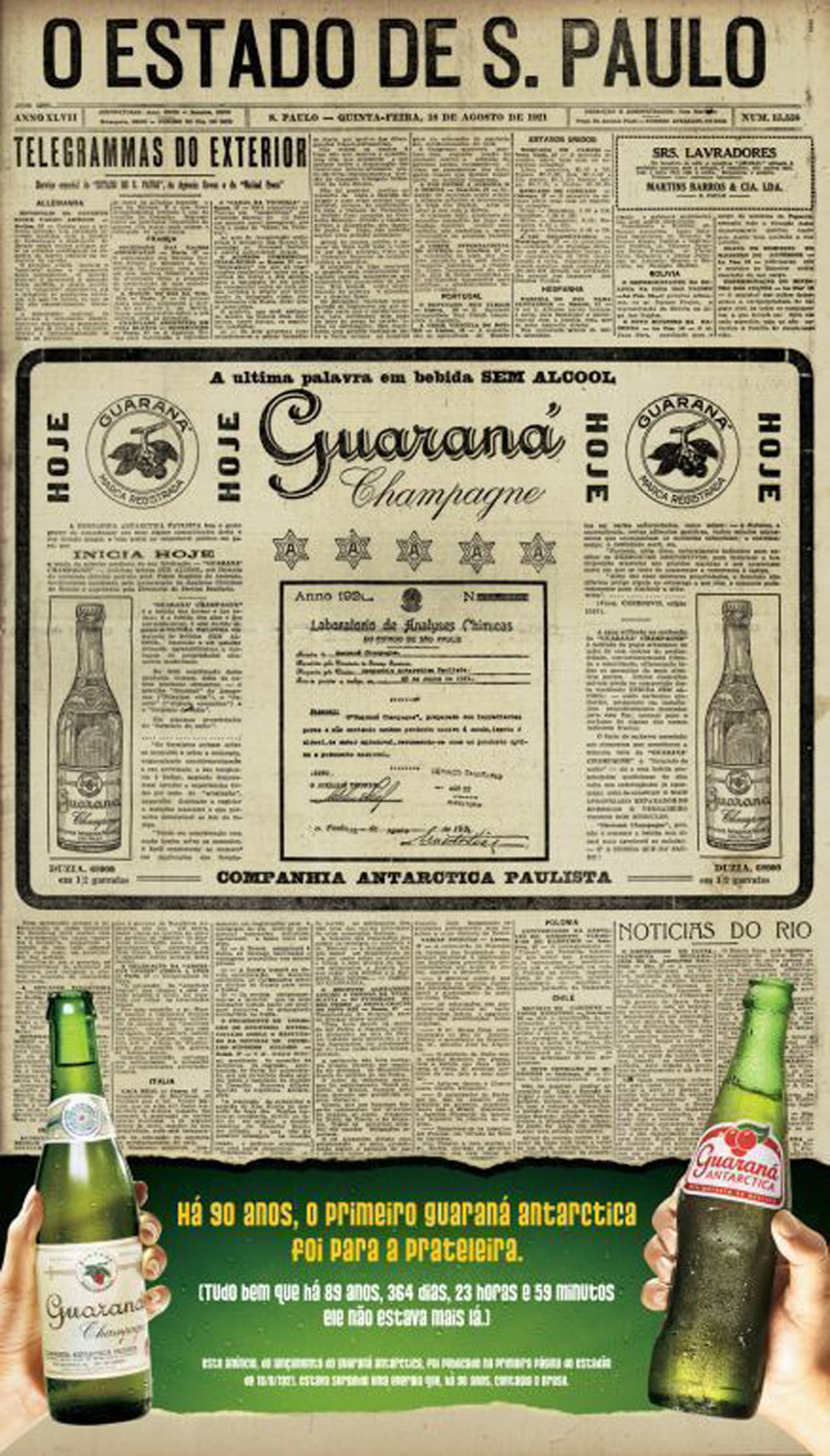 A DM9 criou esses anúncios para o Guaraná Antarctica em comemoração dos seus 90 anos. Eles reproduziram os anúncios veinculados nos principais jornais de São Paulo no dia 18 de agosto de 1921.