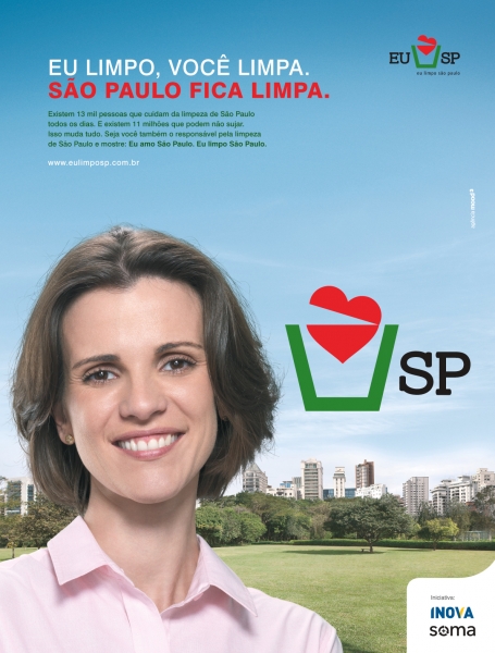 A partir desta semana o serviço Limpeza Urbana, administrado pelas empresas Inova e Soma, vai à mídia convocar os moradores de São Paulo a fazerem parte de um grande movimento para manter a cidade limpa. Criada pela agência Mood, trata-se de uma verdadeira campanha de mobilização cujo objetivo é conscientizar a população da importância de assumirem um papel ativo na limpeza da cidade. Com o apelo “Eu limpo São Paulo”, peças publicitárias e campanha na internet pedem para que todos evitem deixar a cidade suja e estejam atentos aos serviços prestados por ambas as empresas.