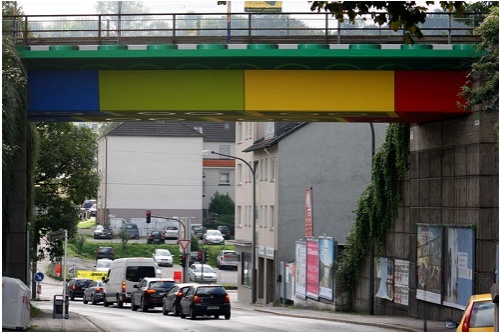 O grafiteiro alemão Martin Heuwold, conhecido como MEGX, pintou uma ponte de 250 metros quadrados de modo que ela parecesse ter sido construída com pecinhas de Lego.