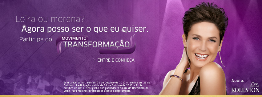 Quem postar uma foto com o novo visual na fanpage da marca até o dia 21 de outubro pode ter a chance de conhecer a Xuxa em um dia de gravação no Rio de Janeiro e de ganhar um ano de Koleston na nuance usada nos cabelos. Além de compartilhar a foto pelo aplicativo do concurso “Movimento Transformação”, os participantes devem contar a história que envolve a mudança. Os autores das quatro melhores “transformações”, de acordo com uma comissão julgadora da Wella, também serão estrelas de posts na timeline do Facebook da marca. O resultado sai no dia 26 de outubro.
