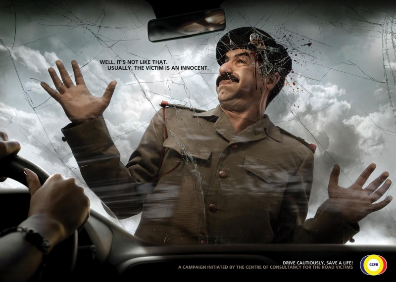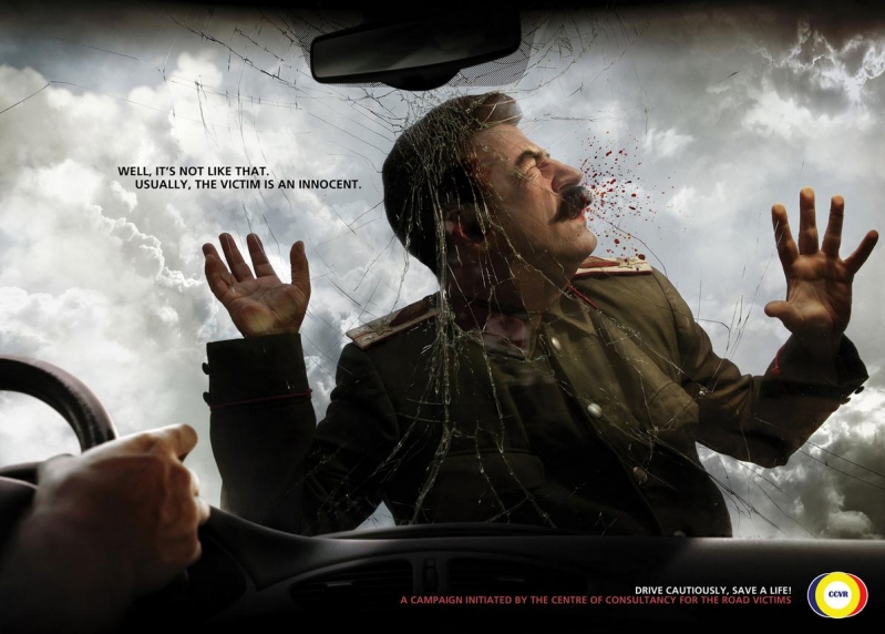 “Bem, não é sempre assim. Geralmente, a vítima é um inocente“. É o que diz o anúncio criado por uma organização de vitimas de acidentes rodoviários. Com o intuito de conscientizar as pessoas para que elas tenham consciência na hora de dirigir, as imagens grandes vilões da História esborrachados no para-brisa de um carro.
