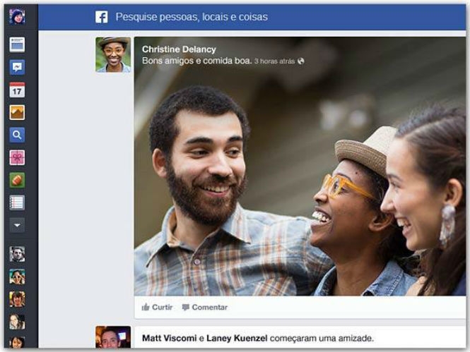 O menu à esquerda, onde ficam os grupos de que a pessoa participa, passa a ser formado por uma coluna estreita de ícones. Mas é possível expandi-lo para que apareçam os nomes de cada um. Essa mudança libera espaço na tela para que a coluna central fique mais larga. É o que permitiu aumentar o tamanho das fotos e vídeos exibidos.
