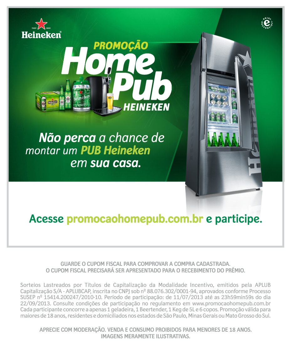 A promoção, que vai até o dia 22 de setembro, envolve cerca de 400 pontos de venda nos estados de São Paulo, Minas Gerais e Mato Grosso do Sul, tem a assinatura da agência I.C.E. Propaganda e promete transformar a casa dos amantes da cerveja num verdadeiro e exclusivo Pub Heineken.