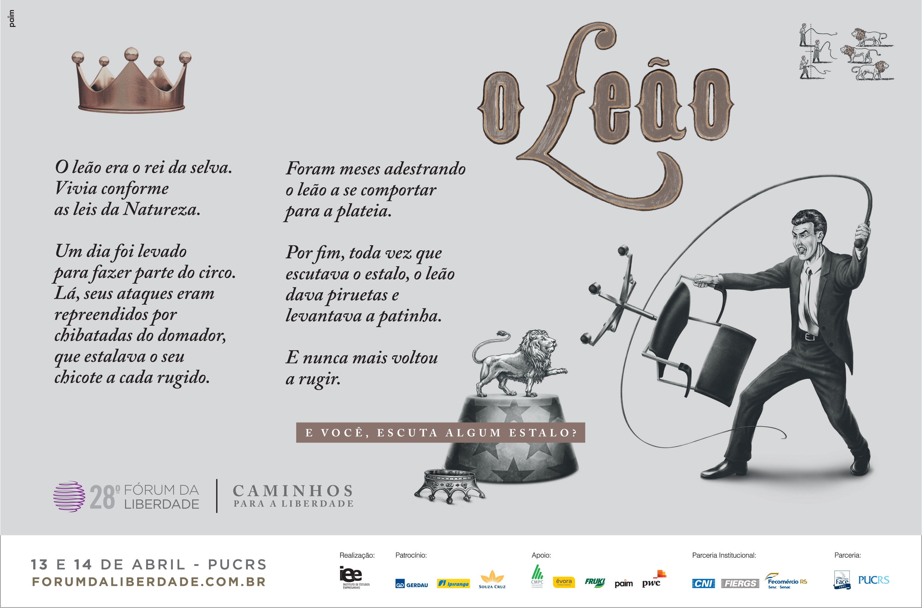 Instigar pessoas à quebra de limites na hora de pensar, executar alguma atividade ou buscar objetivos foi o que inspirou a Paim Comunicação na criação da campanha para o 28º Fórum da Liberdade. Promovido pelo Instituto de Estudos Empresariais (IEE), o evento traz palestras e painéis com a presença de importantes personalidades. A ideia das peças é apontar caminhos para a liberdade, levantando questões como autonomia e estimulando as pessoas a “saírem da caixa” para alcançar o sucesso. Por meio de fábulas, a agência mostra que a imposição de regras e princípios rígidos são limitadores de ideias e projetos.