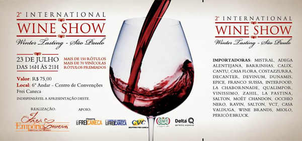 A segunda edição da “International Wine Show” será realizada no hoje, dia 23 de julho (quinta-feira), das 16 às 21 horas, no 6º Piso do Centro de Convenções Frei Caneca. A “International Wine Show 2015” é promovida pelo Empório Frei Caneca e conta com apoio do Centro de Convenções Frei Caneca, Shopping Frei Caneca, Ceratti, CVC e Delta.