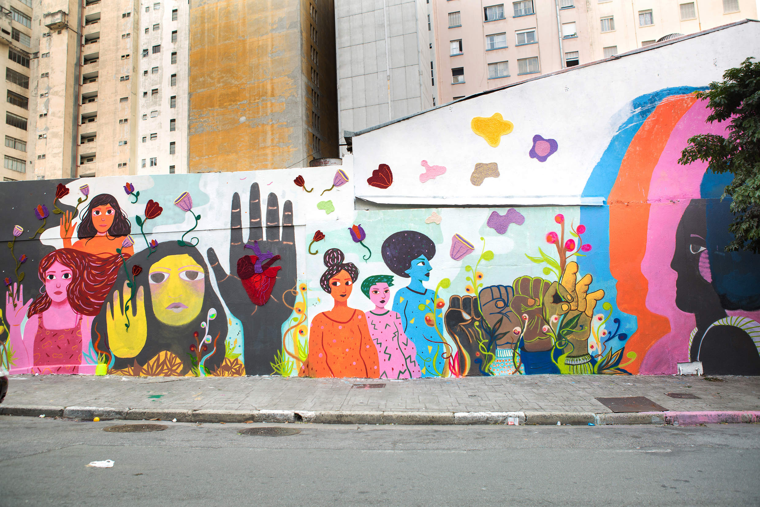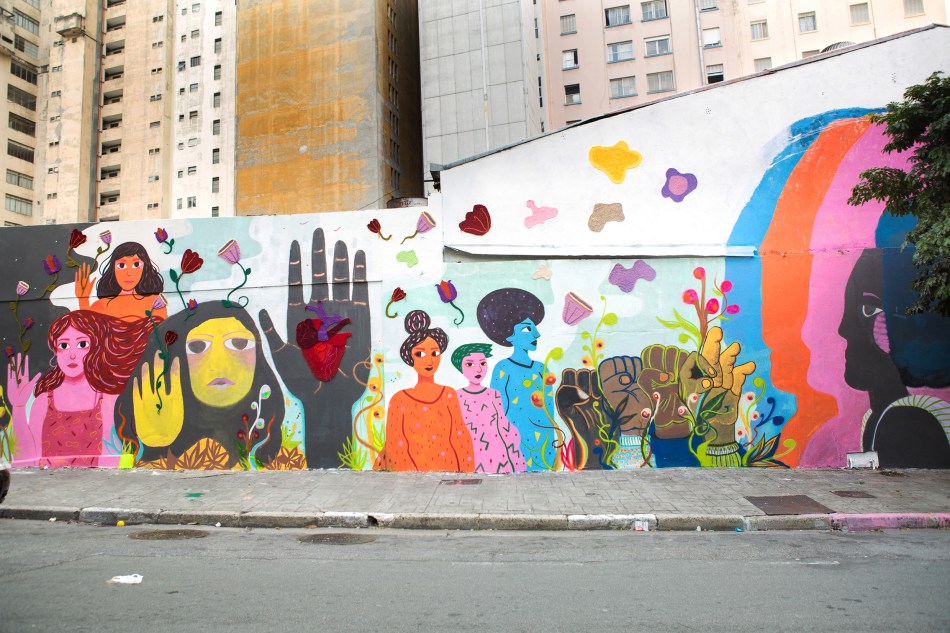 Já em São Paulo, a obra de Rafa Miqueleto intitulada “Não deixe o ‘mas é só por um minuto’ vencer” (Av. Guilherme Dummont Villares, 1269), utiliza papel e balões para humanizar o ícone da vaga de deficientes. Enquanto isso, do outro lado da cidade, o painel gigante “Não deixe o ‘Fiu-Fiu’ vencer” (Rua Nestor Pestana), das artistas Karen Dolorez, Paula Jardim e Marcela Tamayo, usa o crochê como elemento central do grafite para incentivar a busca das mulheres por respeito, combate ao assédio constrangedor e liberdade nas ruas e em suas relações.