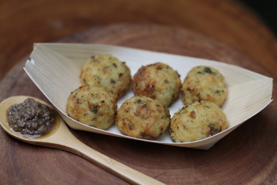 Delicioso bolinho de risoto de bacalhau com queijo gruyère temperado com cebola, alho, salsinha, cebolinha, vinho branco, azeite e ghee.