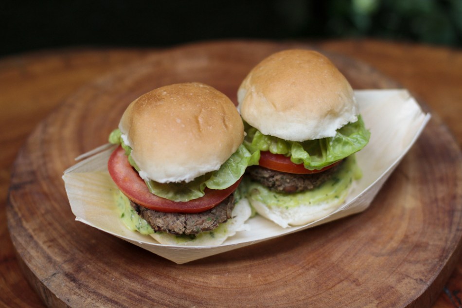 Mini pão de batata, hambúrguer vegetariano de lentilha temperado com cebola, alho, salsinha, cebolinha e aveia. Finalizado com rodela de tomate e maionese de ervas.