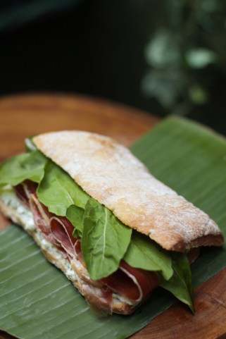 Ciabatta recheada de presunto Parma, ricota e rúcula, temperada com salsinha e azeite.