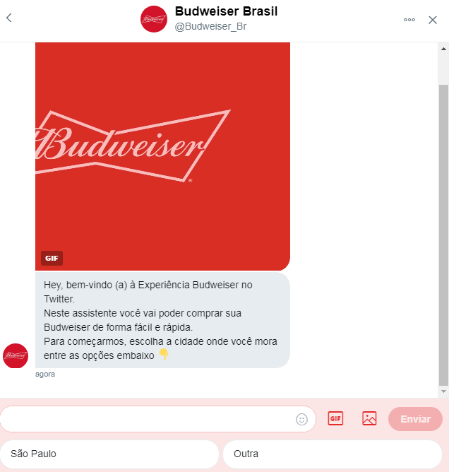 O serviço da Budweiser na TBS funciona de maneira simples: os consumidores podem iniciar uma conversa com o perfil @Budweiser_Br no ambiente privado das Mensagens Diretas (DMs), que passa a responder, de forma automatizada e inteligente, com diversos botões e indicações para respostas. A partir dessa interação, é possível fazer encomendas para receber em casa packs e kits de Budweiser entregues pelo Empório da Cerveja, loja online especializada em bebidas.