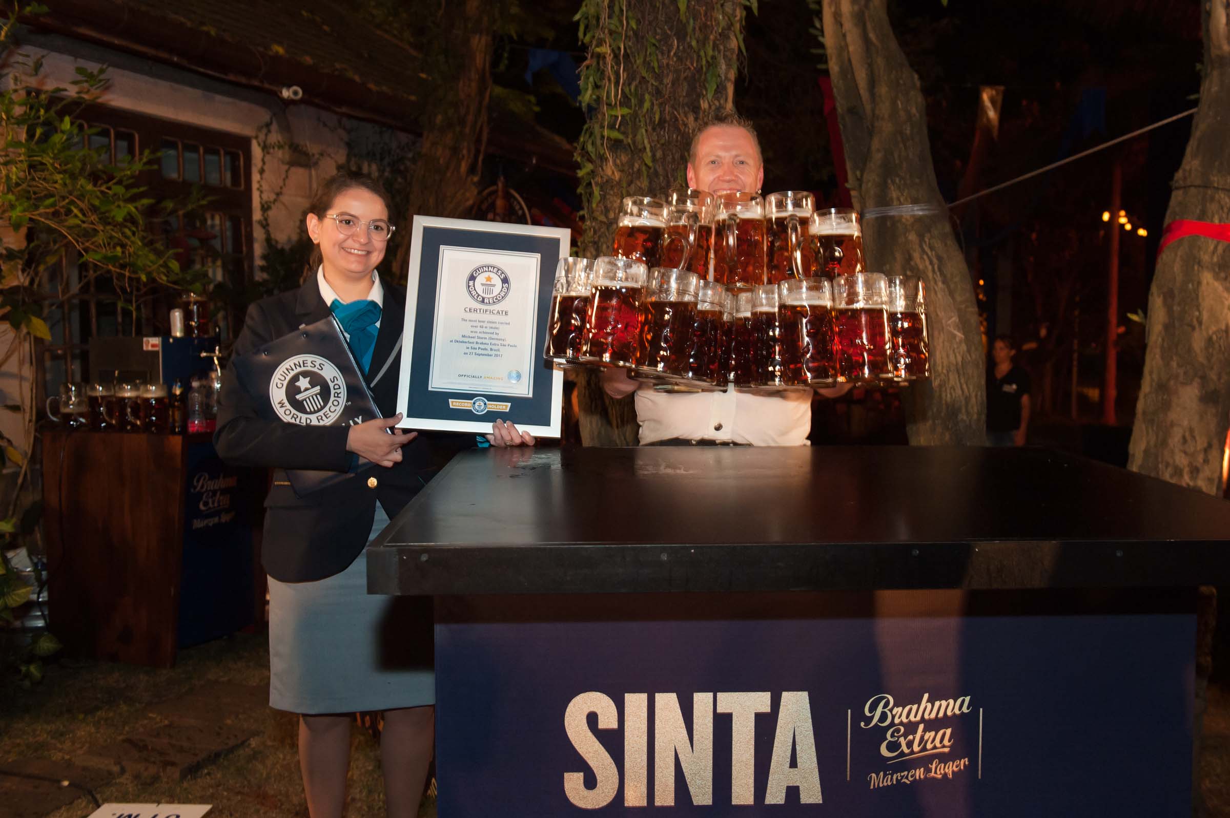 Em um evento da cervejaria Brahma realizado nesta quarta-feira, (estivemos lá, veja aqui como foi) o garçom alemão Michael Sturm estabeleceu novo recorde mundial para o maior número de canecas de cerveja de 1 litro carregadas de uma vez e entrou para o Guiness Book no Oktoberfest Brahma Extra São Paulo. O fato histórico foi conquistado na Rua Alemanha, em São Paulo, em uma festa que trouxe toda a tradição alemã do Oktoberfest com direito a torcida brasileira na emocionante caminhada.