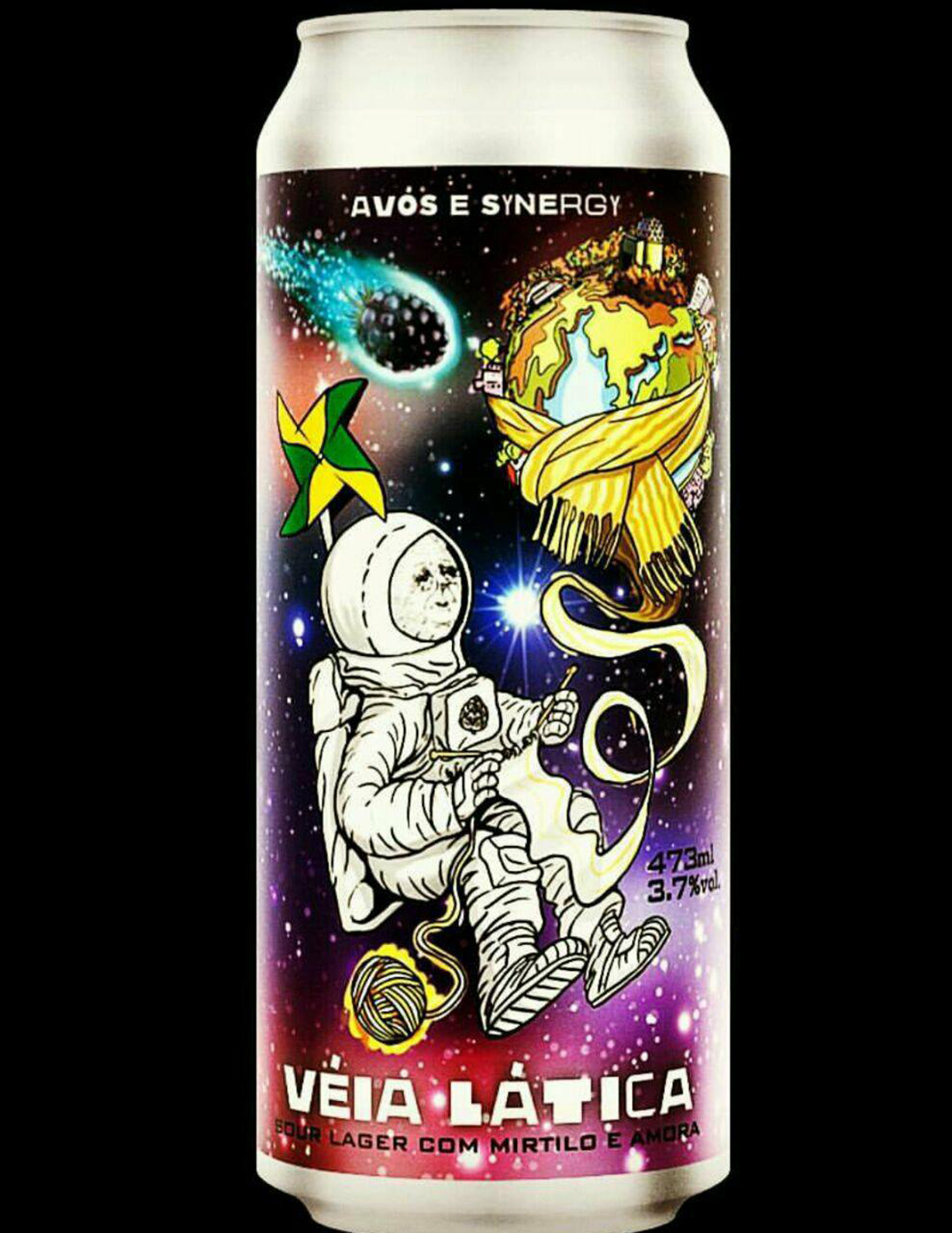 Ilustra o rótulo de fundo preto e roxo, uma versão espacial das já emblemáticas caricaturas da cerveja Avós. A Véia Lática é uma senhora vestida com roupa de astronauta, com traços bem humorados e elementos que remetem à sua aventura nas galáxias, viagem que ela percorreu agarrada ao seu catavento (símbolo da cervejaria Synergy), impulsionada por quantidades generosas de amora e mirtilo.