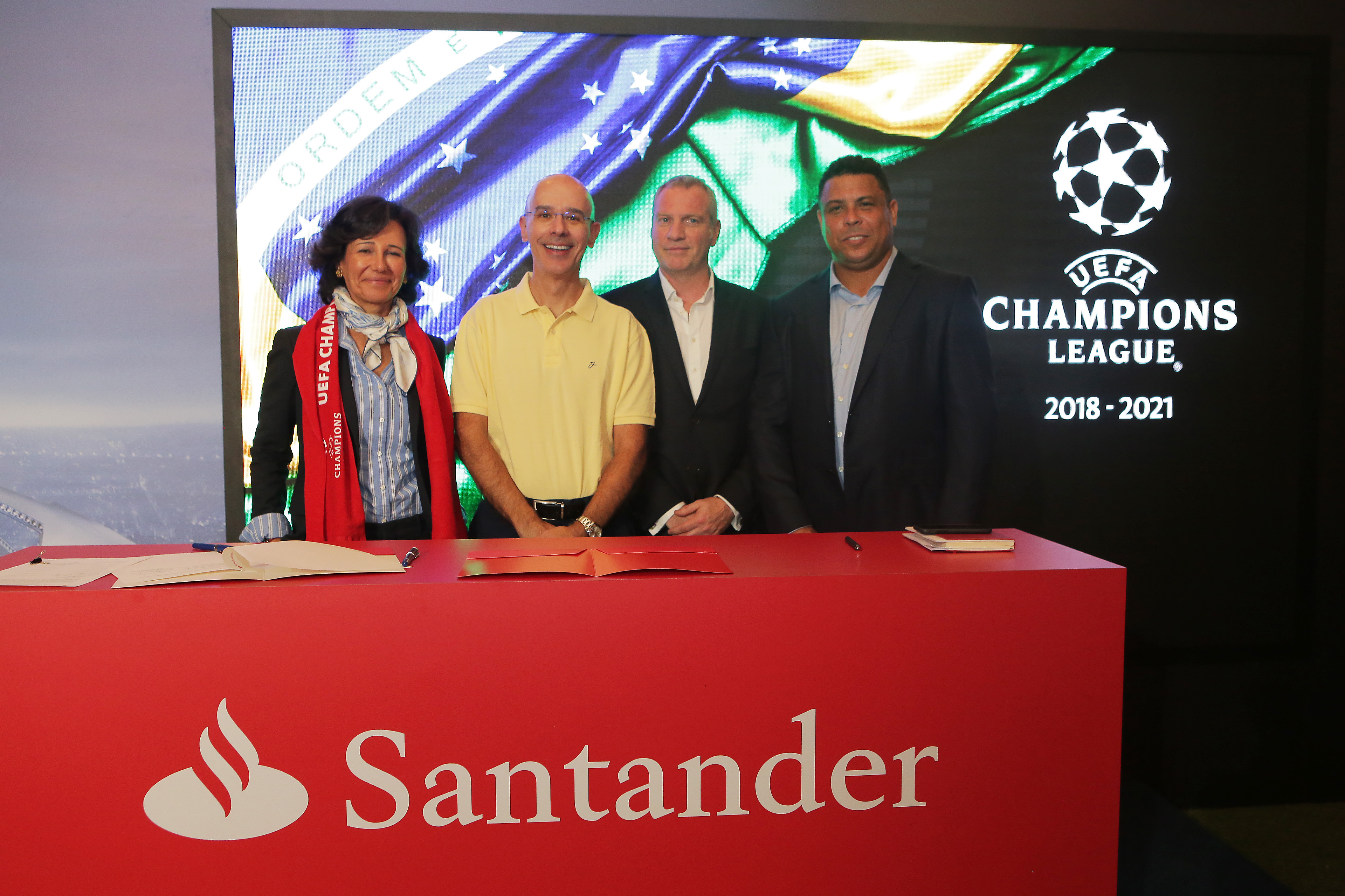 A presidente do Banco Santander, Ana Botín, e os executivos dos dez principais mercados do banco assinaram o acordo hoje, no Brasil, juntamente com um representante da UEFA. O ato também contou com a participação de duas figuras do futebol mundial, os brasileiros Ronaldo, presente no evento, e Pelé, que enviou um vídeo.