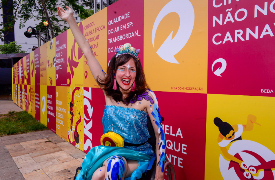 “Eu não gosto de aparecer, sou mais de falar, mas achei essa ação de SKOL tão legal que aceitei participar”, ela pintou o corpo e se vestiu de sereia para comemorar o carnaval. “Antes do meu acidente eu era o padrão. Alta, magra… depois precisei repensar tudo e quanto mais ações incluírem as pessoas com deficiência, melhor”, comentou.