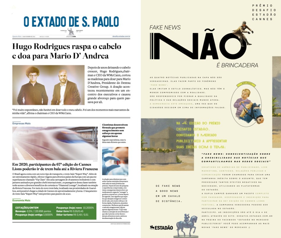 Diante de um fenômeno que tem ganhado cada vez mais espaço na mídia mundial, as fake news têm provocado diversos efeitos negativos na sociedade. Para alerta-los sobre esse fato, oEstadão escolheu o tema para convidar todos os publicitários a criarem uma campanha inédita para a categoria Brief Desafio – projeto da 4ª edição do Prêmio Desafio Estadão Cannes. Para ativar as inscrições, o veículo promoveu uma ação de ativação, criada pela Giusti Comunicação. Mais de 2 mil exemplares estão sendo distribuídos para mídias e criativos das principais agências do País, com notícias fakes sobre o mercado publicitário e assuntos de interesse geral.