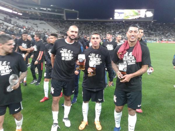 As taças comemorativas da Estrella Galicia 0,0 estiveram presentes na comemoração do título paulista conquistado pelo Corinthians no fim de semana passado. No último domingo jogadores e comissão técnica puderam festejar junto ao seus torcedores em ação que já virou tradição no clube.