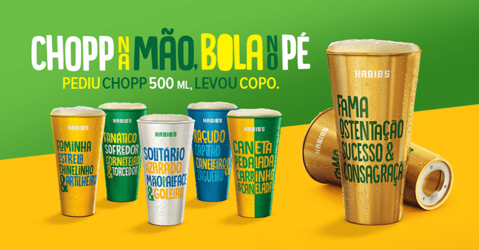 Já a campanha “Chopp na mão, Bola no Pé” traz para o cliente cinco modelos de copos, nas cores verde, amarelo, azul e branco, especialmente, criados para as comemorações do mundial da Rússia. O cliente que pedir um chopp de 500 ml, recebe a bebida em um dos copos, que trazem palavras relacionadas ao mundo do futebol: fominha, caneta, pelada, carrinho, fanático, estrela, entre outras. E para quem vai torcer junto com a galera, o sexto chopp, no mesmo pedido, dá direito a um modelo de copo exclusivo, todo dourado com um abridor no fundo – o hexa do Habib’s.