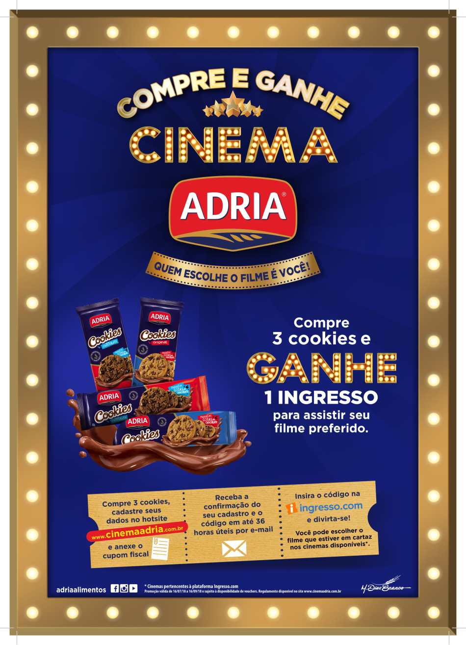 A Adria, uma das principais marcas de massas, biscoitos e torradas do país, traz uma novidade para os seus consumidores. Comprando três pacotes de Cookies Adria no mesmo cupom fiscal e cadastrando-se no site, todos os participantes ganharão um ingresso para assistir aos filmes em cartaz disponíveis na plataforma ingresso.com.