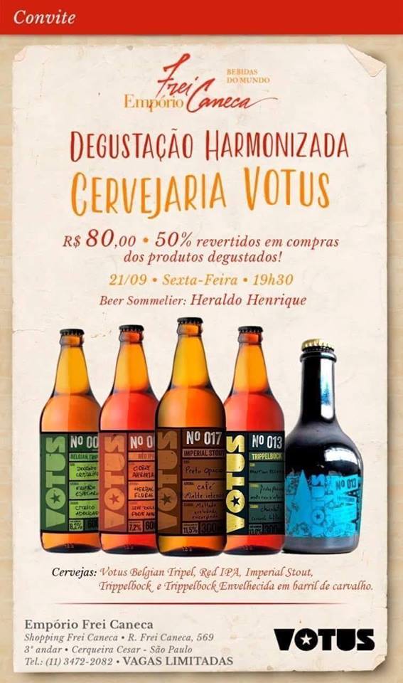 A Votus, microcervejaria de São Paulo, apresentará no Empório Frei Caneca, dia 21 de setembro, às 19h00, uma palestra com degustação harmonizada dos seus principais rótulos.