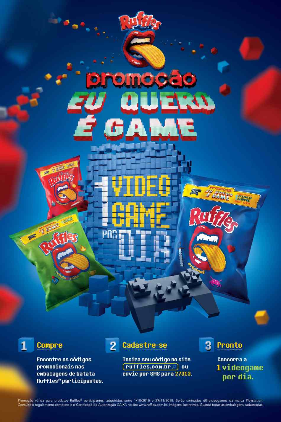 As embalagens da marca foram “gameficadas” com o logo em pixels, para se relacionar ainda mais com o público gamer, e todas as versões (17g, 30g, 57g, 96g e 167g) terão códigos que podem ser cadastrados no site www.ruffles.com.br ou enviados via SMS para 27313. A promoção, com campanha desenvolvida pela Almap BBDO e mecânica assinada pela Bullet, é válida em todo o território nacional.