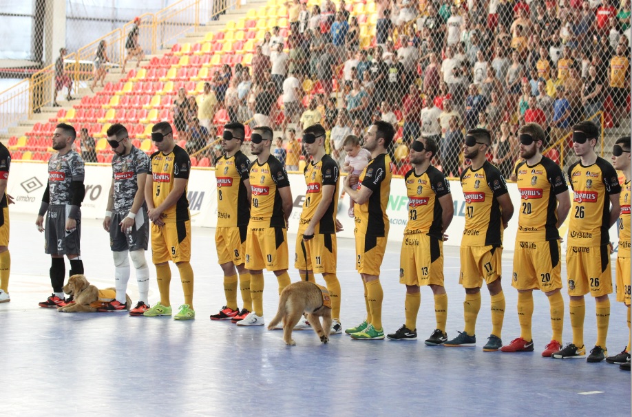 No início do jogo, o capitão do Magnus Futsal, Rodrigo, entrou vendado e foi conduzido pelo cão-guia Bento, que o levou ao centro da quadra. Logo atrás, representando as famílias socializadoras, o goleiro Tiago, o ala Falcão e o pivô Adriano Foglia estavam acompanhados de futuros cães-guias e puxaram uma fila com os demais jogadores, também vendados para representar os deficientes visuais.