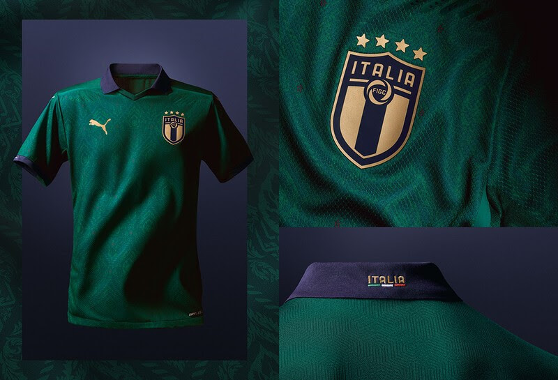 Os elementos de design icônicos exclusivos, conhecidos como patterns, ajudam a nova camisa italiana a revelar a grandeza de sua história e nação, enaltecendo a nova onda de talentos que se destaca no país, dentro e fora do campo. A nova geração da seleção italiana conta com 12 jovens jogadores abaixo dos 25 anos de idade. Já a cor do terceiro uniforme traz de volta à ‘Maglia Verde’ (camisa verde), usada durante a vitória Azzurri contra a Argentina, no Estádio Olímpico de Roma, em dezembro de 1954. Historicamente, a seleção italiana usou verde em apenas um jogo, porém os times de base adotaram a cor em seus uniformes número um. O icônico azul Azzurri permaneceu exclusivo para o time principal e foi usado como motivação para jovens jogadores ganharem o direito de usar a camisa.