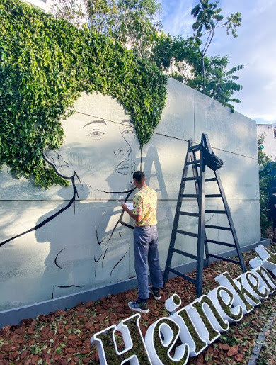 Um grafite work in progress, assinado pelo coletivo 8 ou 80, interage com o ambiente urban jungle proposto pela Heineken®.