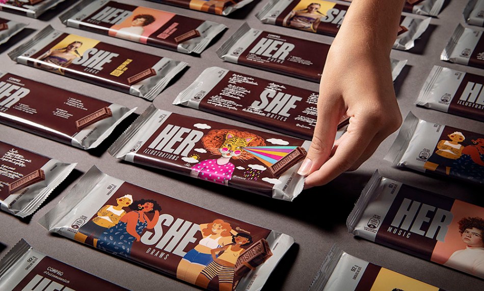 Imagina iluminar as palavras Her e She (pronomes em inglês que significam ‘dela’ e ‘ela’), presentes desde sempre no nome da marca Hershey’s… Esse foi o ponto de partida, em parceria com a agência BETC/Havas, para promover e valorizar o talento feminino. A campanha, batizada de HerShe, transforma a embalagem da barra de chocolate ao leite, a mais tradicional da marca, em uma galeria de divulgação do trabalho de musicistas, cantoras, ilustradoras, poetisas e escritoras e várias outras mulheres talentosas, com lançamento no Dia Internacional da Mulher.