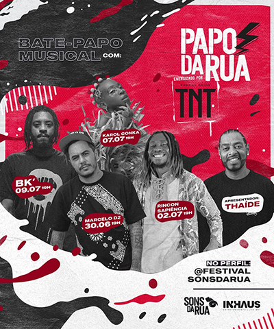 Os convidados são artistas consagrados no cenário hip hop nacional, como Karol Conka, BK, Rincon Sapiência e Marcelo D2, que estreia a live talk nesta terça-feira (30). O Papo de Rua TNT vai acontecer às 19h, no perfil do Instagram @festivalsonsdarua, nos dias 30 de junho e 2, 7 e 9 de julho. As lives talks vão discutir o atual momento, liberdade de expressão e o incentivo à cultura hip hop.