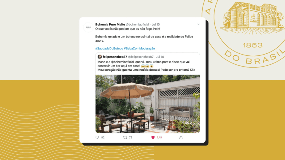 Quem nunca interagiu com uma marca nas redes sociais? Imagina você enviar uma resposta e receber como retorno uma resposta inesperada? Foi essa mensagem que um consumidor de Bohemia recebeu após comentar sobre sua saudade do boteco. A ação teve início nas redes sociais e chegou até o quintal do consumidor em apenas dois dias.