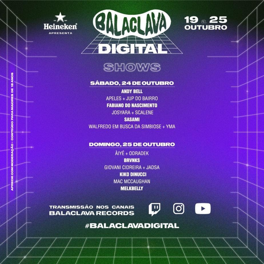 A partir da parceria entre a marca Heineken® e a plataforma de música Balaclava Records, a primeira edição do “Balaclava Digital” acontece entre os dias 19 e 25 de outubro, trazendo grande diversidade de conteúdo e uma extensa lista de atrações em uma programação 100% gratuita. Durante o final de semana do festival, dias 24 e 25 de outubro, das 19h até as 22h, artistas nacionais e internacionais de destaque na cena indie, apresentarão shows exclusivos em formatos especiais para o público conectado no canal da Balaclava Records na Twitch.