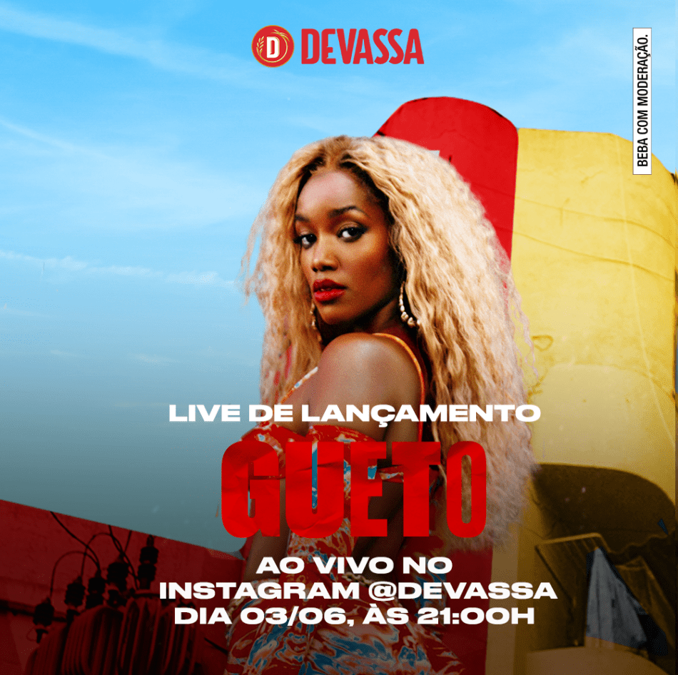 Na quinta-feira, 3 de junho, acontece o lançamento do projeto “Criatividade Tropical: abre as portas para o gueto”, protagonizado pela cantora Iza em parceria com a Devassa. Criado pela agência Atenas para a cervejaria, o start da ação acontece com um show que apresenta o novo single de Iza, “Gueto”, em uma tour digital sediada no Rio de Janeiro na noite da quinta-feira (3).