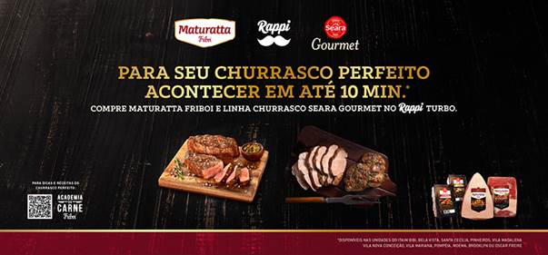 As linhas Maturatta Friboi, a carne oficial do churrasco perfeito, 1953 Friboi e Seara Gourmet, com produtos que oferecem as melhores seleções de carnes, as melhores matérias-primas e processos inovadores, apresentam uma parceria com a Rappi Turbo. A ação, válida para alguns pontos da cidade de São Paulo, vai presentear os dois mil primeiros clientes da plataforma que pedirem carnes Maturatta Friboi, 1953 Friboi e a nova linha Churrasco Seara Gourmet (com cortes especiais de aves e suínos, marinados com temperos selecionados, práticos e saborosos para um churrasco especial gourmet).