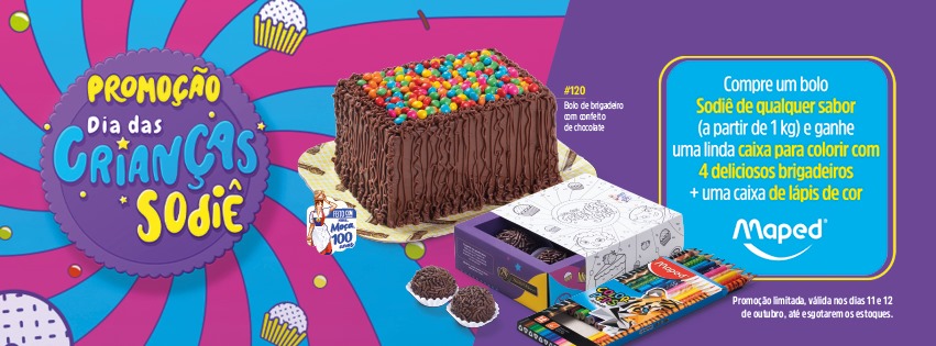 Na compra de qualquer sabor de bolo da Sodiê, o consumidor ganha uma caixa para pintar com 4 brigadeiros produzidos com Leite Moça® e uma caixa com 12 lápis de cor da Maped.