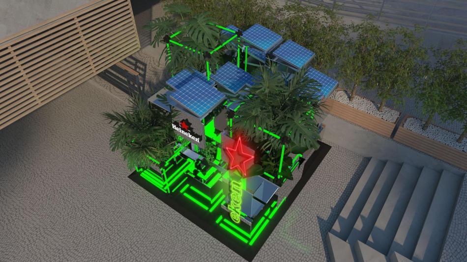 A estrutura, desenvolvida em parceria com a M.O.E., consiste em 28 placas fotovoltaicas que ocupam o espaço de 70m² na entrada do museu. Juntas, elas formam a usina que vai captar energia limpa e será conectada a geradores, abastecendo as ativações da marca, desenvolvidas em conjunto com Atenas: o Heineken Stage, palco onde DJs se apresentarão durante os três dias de festival. O espaço também conta com placas solares que geram energia e abastecem a instalação artística formada por plantas e luzes, fazendo com que o público sinta o movimento pulsante e vivo da natureza. Além do Heineken Stage, o Greener Bar também será totalmente abastecido por energia verde.
