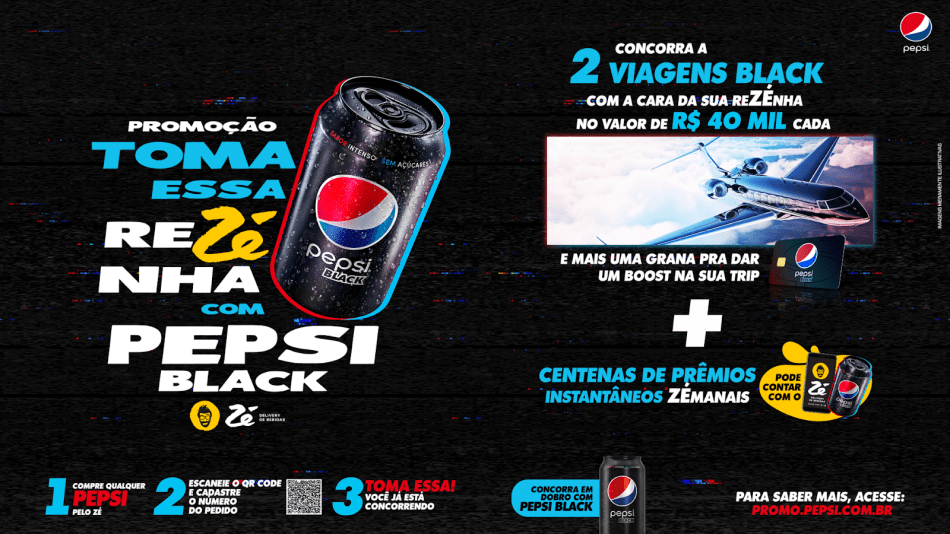 Para participar e concorrer a viagens* incríveis, muitos prêmios instantâneos e kits semanais, o consumidor deve comprar qualquer produto PEPSI® (PEPSI® Blue, PEPSI® Black e PEPSI® Twist de todos os tamanhos) na plataforma Zé Delivery® e cadastrar o comprovante de pagamento da compra diretamente no site. Comprando PEPSI® Black no ZÉ DELIVERY®, os participantes ganham chances em dobro nos sorteios. A participação é válida para pessoas físicas, com idade igual ou superior a 18 anos, entre os dias 08 de setembro a 10 de outubro.