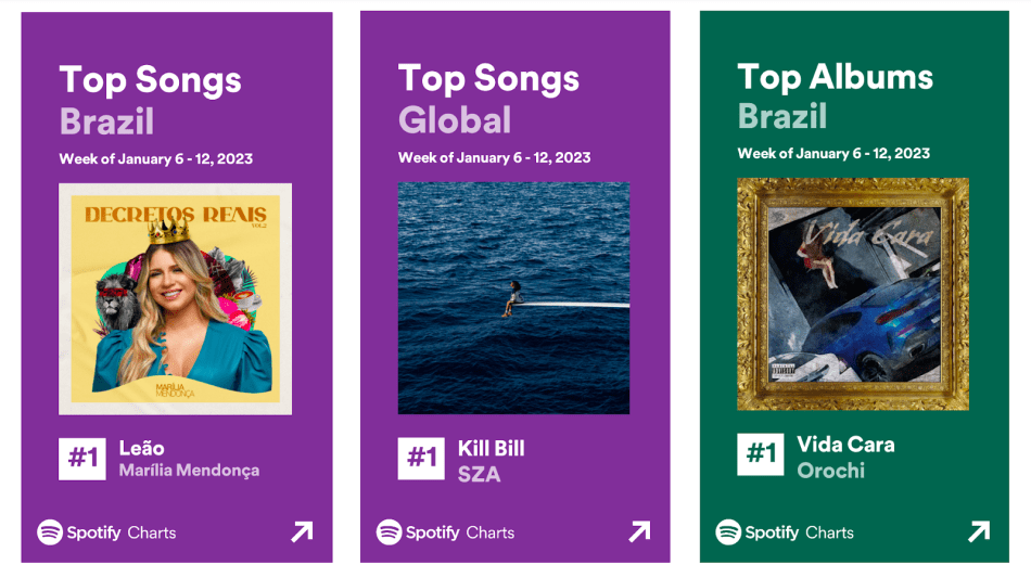 - Leão, de Marília Mendonça, foi a que mais subiu no ranking de Top Músicas Global, da 116ª para a 55ª posição. Até ontem, 15 de janeiro, a faixa ocupava a 36ª posição. (6-12/jan)