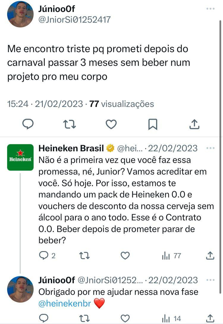 “Para nós, foi muito importante aproveitar a oportunidade do pós-carnaval para conectar a Heineken 0.0 com os consumidores, mostrando que o produto é uma ótima opção para aqueles que desejam continuar aproveitando o sabor da nossa cerveja premium, mas optaram por uma pausa na ingestão de bebida alcoólica. Além disso, utilizar o Twitter para a ação é uma forma de entrar na conversa e estar cada vez mais próximo dos nossos consumidores”, afirma Igor de Castro Oliveira, gerente sênior da marca Heineken® 0.0 no Brasil.