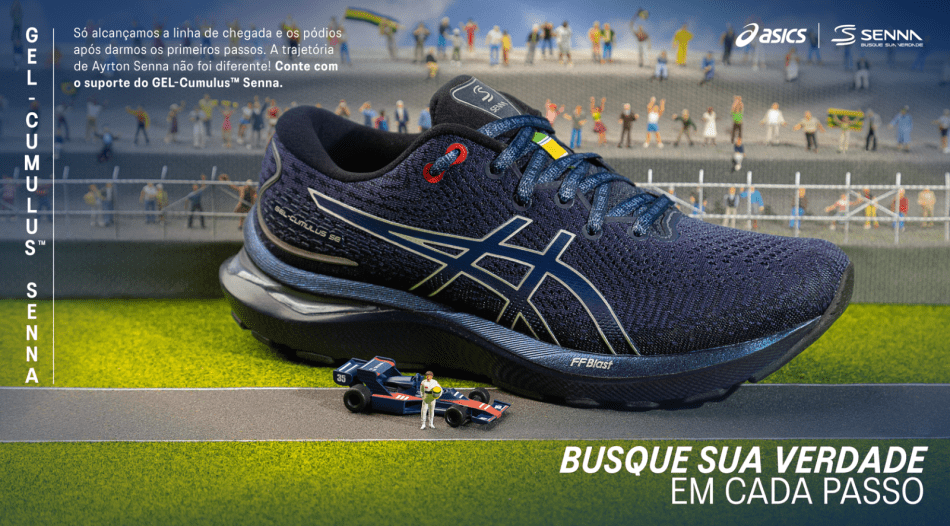 Ainda para ajudar a contar essa história, a identidade visual da campanha do novo GEL-Cumulus Senna foi feita em parceria com o fotógrafo Renan Viana, do canal “Encolhi as Pessoas”. Ele criou miniaturas do Senna corredor de rua e piloto de F1 e as colocou para serem fotografadas junto com o tênis.