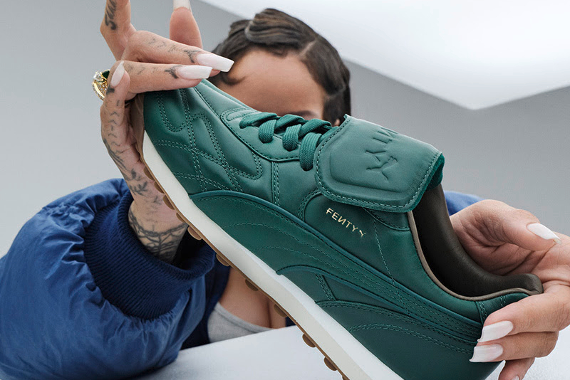Ambas as opções de cores apresentam couro tratado com óleo, uma faixa de couro tonal com detalhes que aprimoram sua estética, cadarços dourados e o logotipo FENTY em relevo na língua.