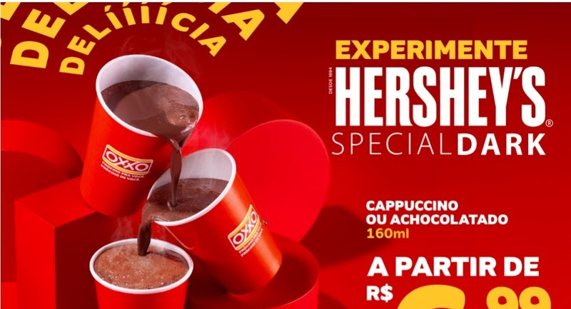 Uma collab entre OXXO, Gran Coffee e uma das maiores fabricantes de chocolate do mundo, a Hershey, irá lançar com exclusividade nas lojas da rede a bebida de chocolate Hershey’s Special Dark, licenciada pela Gran Coffee, empresa líder em soluções automáticas para cafés e bebidas quentes no país. O produto passa a fazer parte do cardápio de bebidas “chocolatudas” das lojas OXXO.