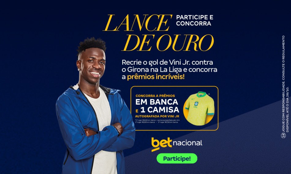 Os participantes devem recriar o gol e postar em seus perfis, marcando o perfil da Betnacional e usando a hashtag #lancebetnacional em um vídeo de até um minuto. Além disso, devem responder na legenda à pergunta: “Por que Vini Jr. merece trazer a Bola de Ouro para casa?” Os três conteúdos mais curtidos e comentados serão premiados com valores em banca no site da bet, sendo que o primeiro lugar ainda receberá uma camisa autografada pelo ídolo. A competição começou nesta sexta-feira (18) e vai até o dia 28 de outubro. O post do desafio pode ser acessado aqui.