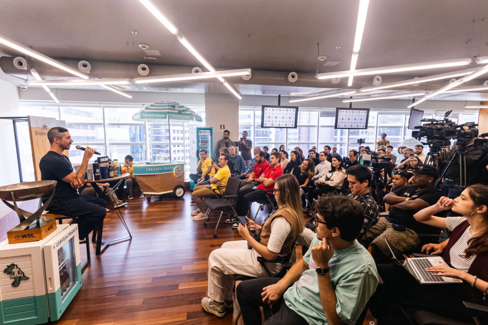 A coletiva aconteceu na sede da companhia, em São Paulo, e contou com a presença de Maurício Giamellaro, CEO do Grupo HEINEKEN no Brasil, Marcos Sifu, fundador da cerveja Praya e Ivan Martinho, CEO LATAM da WSL.