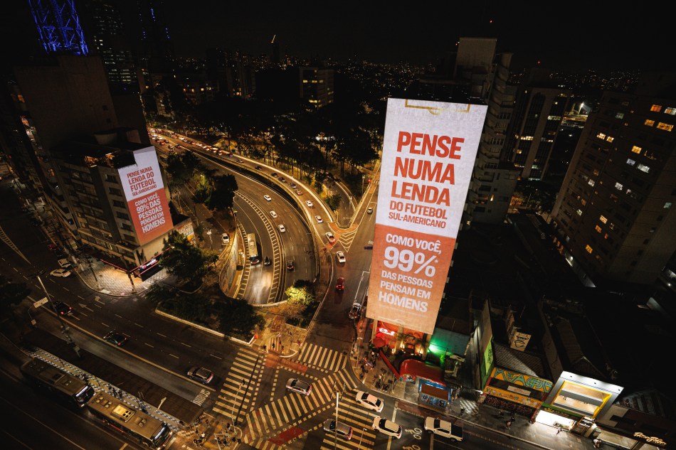 O momento surpresa ficou por conta de uma projeção realizada no edifício em frente ao evento e atraindo a atenção de quem passava pela rua Consolação no começo da noite. Na empena, a Amstel trouxe o resultado de uma provocação feita nas redes sociais dias antes: “Quem é a lenda do futebol sul-americano para você?”. Entre as 993 respostas recebidas, 99,1%, ou 984 respostas, citaram homens, enquanto apenas 0,9%, ou, 9 citações, indicaram jogadoras mulheres. A mensagem é completada com um convite para as pessoas fazerem parte da mudança e celebrarem a potência das mulheres nos esportes.